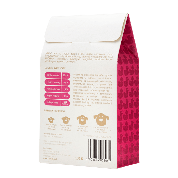 Psiacha z kaczką – naturalne, ręcznie robione ciasteczka dla psa z mięsem kaczki i burakiem