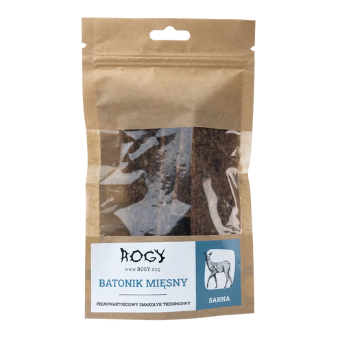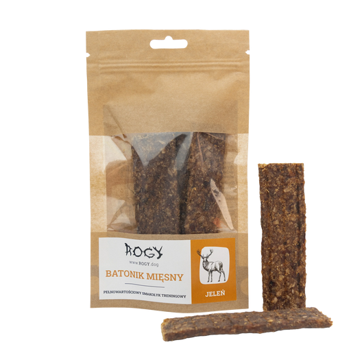RogyROGY Batonik Mięsny z Jelenia 80 g Naturalny przysmak treningowy, który wspiera zdrowie i kondycję psa Codzienna nagroda powinna być nie tylko sm...